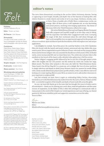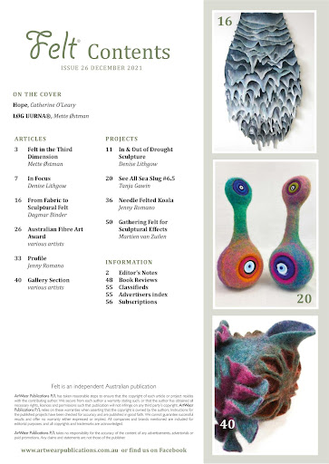 Felt magazine examines traditional felt, Nuno felt, embellishing techniques, dry felting (needle felting and machine punching) and knitted (fulled) felt with a comprehensive mix of articles, projects, profiles and visual inspiration. It contains a mix of easy, intermediate and technical projects to suit a wide range of skill levels.